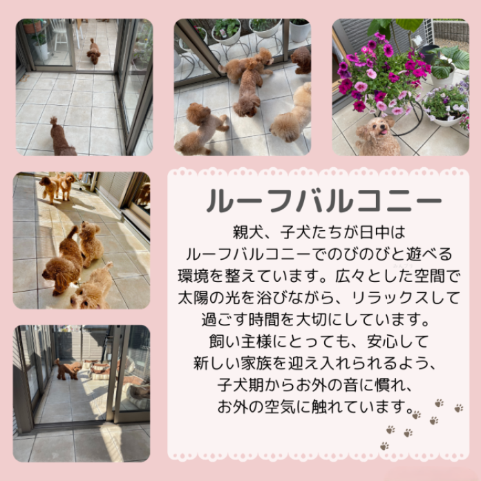出産部屋は、母犬と赤ちゃんが安心して快適に過ごせるよう、衛生面と環境面に細心の注意を払っています。また、親犬たちの部屋はフリーケージスタイルを採用し、窮屈さを感じることなくリラックスして過ごせるよう工夫しています。さらに、太陽の光を浴びながら思いきり体を動かせるルーフバルコニーもあり、毎日のびのびと運動できる環境を整えています。