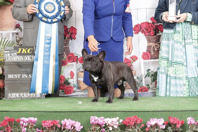 JKCチャンピオン、FCIインターナショナルビューティーチャンピオン、Best In Show受賞、フレンチ・ブルドッグ単犬種展にてBOS(オスの1位)受賞。