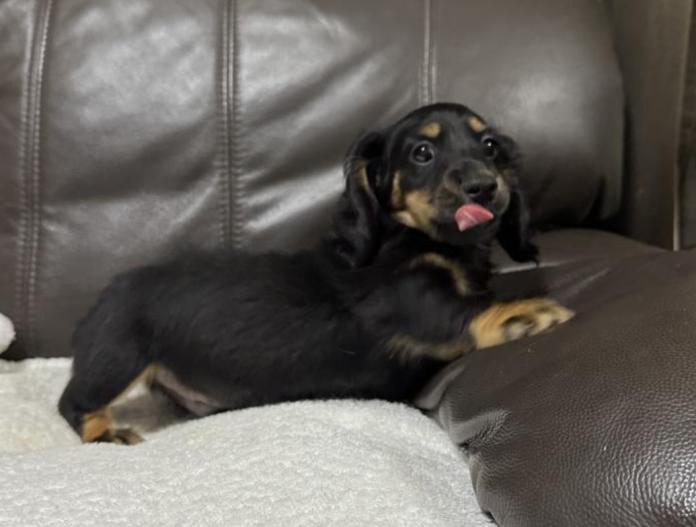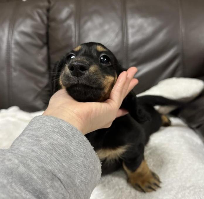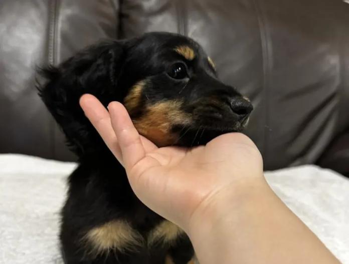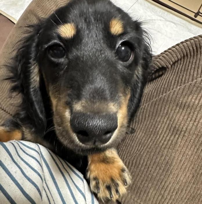 ミニチュアダックスフンド(ロング)、ブラックタンの美しい毛色が映える、とても愛らしい男の子。
