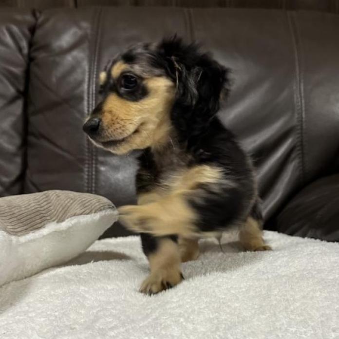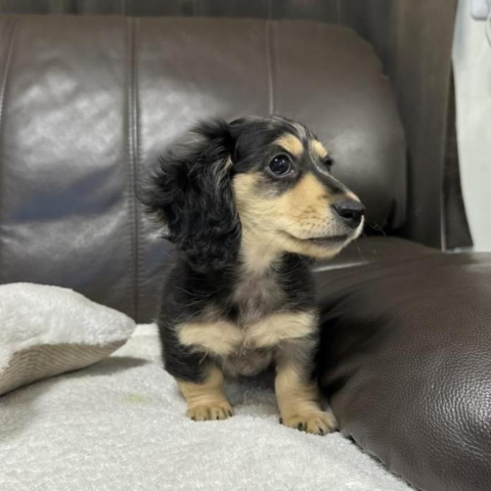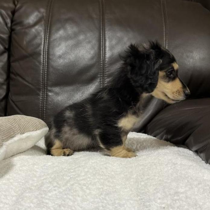 ミニチュアダックスフンド(ロング)、シルバーダップルのとても可愛い男の子。