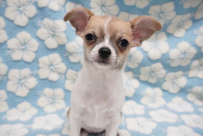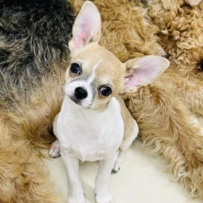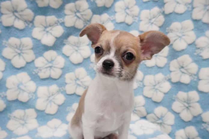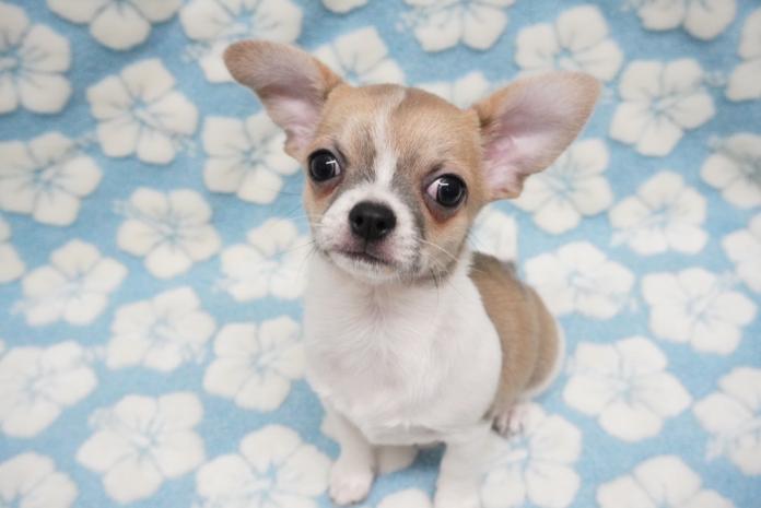 チワワ(スムース)の女の子で、パーティーカラーがとても華やか。ぱっちりとした青い瞳が印象的で、見つめられるたびに吸い込まれそうになる、そんな不思議な魅力を持った子です。