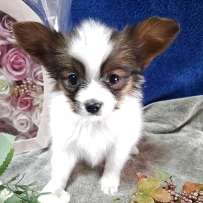 パピヨンらしいホワイト&セーブルの優しい毛色に、ころんとした愛らしい雰囲気で、見ているだけで思わず頬がゆるんでしまいます✨
