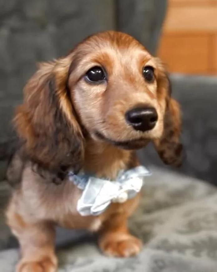 ミニチュアダックスフンド(ロング)、シェーデッドレッドのとってもハンサムな男の子😊 毛色の深みも美しく、将来ますますイケメン君に成長してくれるのが楽しみな子です。