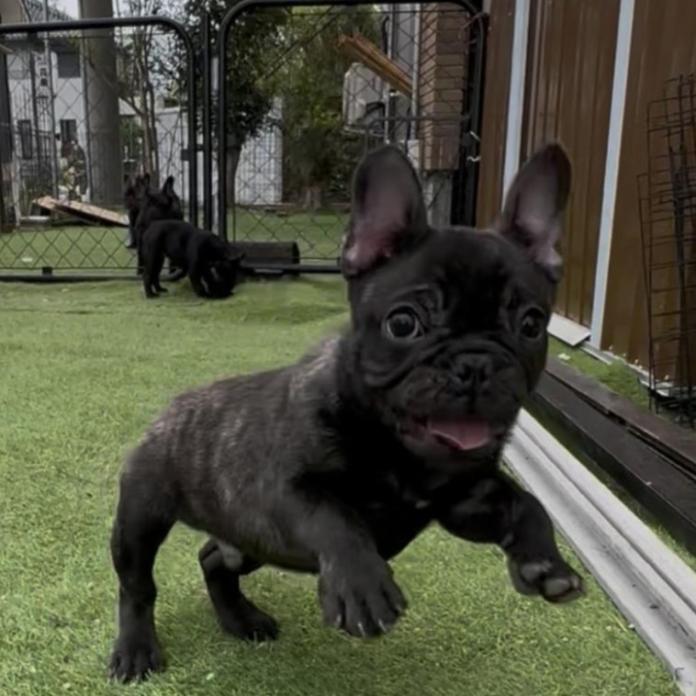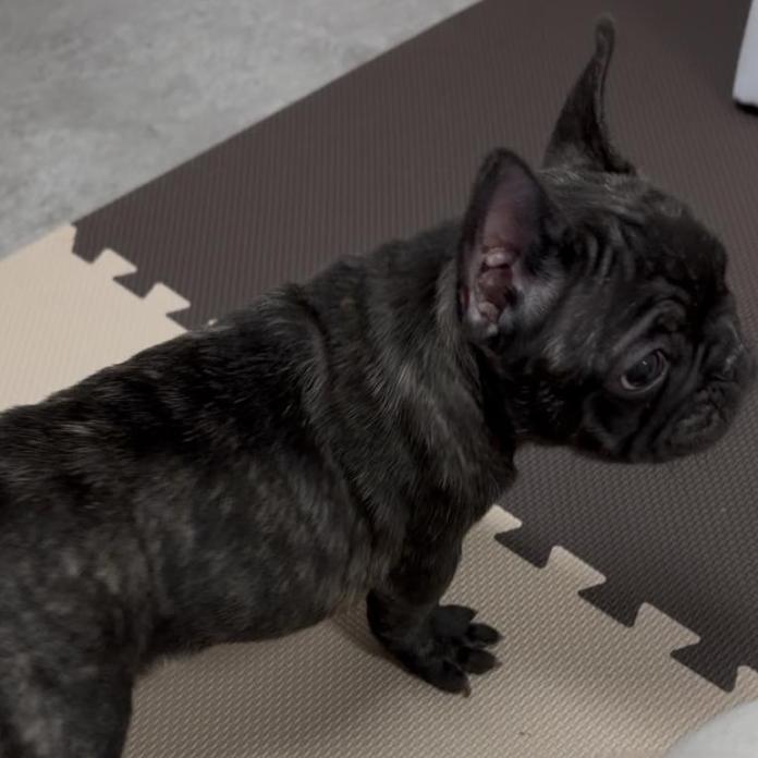 フレンチブルドッグらしい、しっかりとしたブリンドルカラーの男の子です。兄妹の中で唯一の男の子👑 小さな体で元気いっぱいに過ごしています。まだまだあどけないですが、ぷりぷりとした可愛い姿がたまらない子です😊