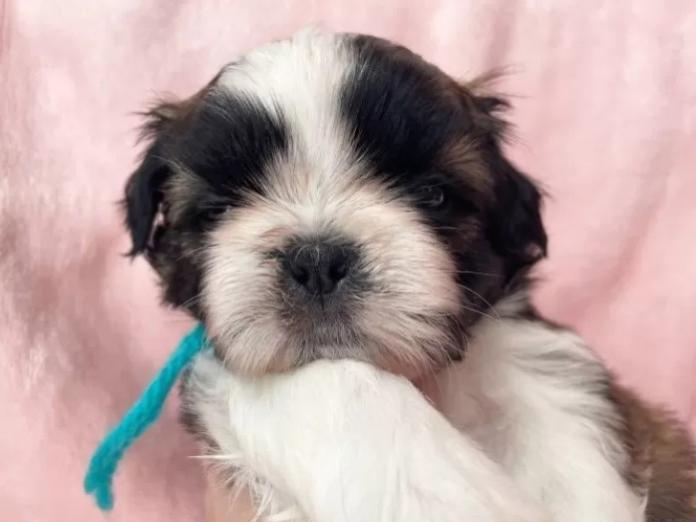 シーズーの男の子、毛色は優しい印象のゴールド&ホワイト。お顔の模様がとても綺麗に入っていて、ぱっと目を引く可愛さがあります。ムチムチとした体つきで、抱き心地も最高な可愛い子です🤍現在はみどり色のリボンを付けています🎀爽やかなカラーがよく似合っていますよ。