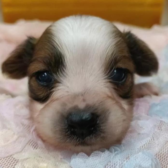 パピヨンの女の子、毛色は華やかなレッドセーブル&ホワイト。やわらかなレッドの差し色とホワイトのバランスがとても美しく、思わず見とれてしまう可愛さです💕整ったお顔立ちで、まさに“美少女ベビー”という言葉がぴったりの子です。