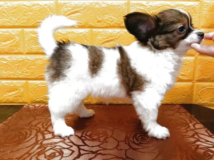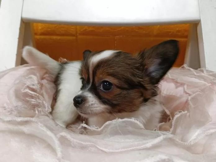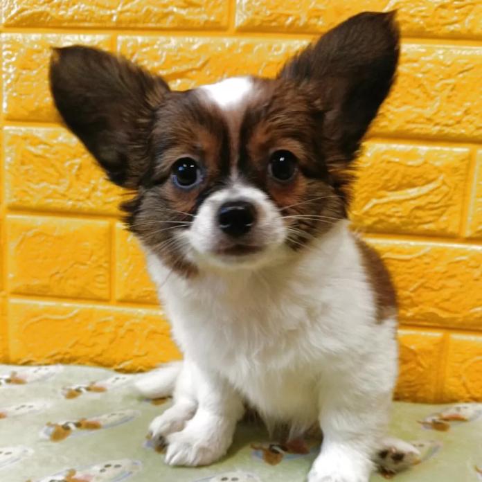 パピヨンの女の子、毛色は華やかなレッドセーブル&ホワイト。やわらかなレッドとホワイトのコントラストがとても美しく、思わず見とれてしまう可愛さです💕整ったお顔立ちで、まさに“美少女ベビー”という言葉がぴったりの子です。