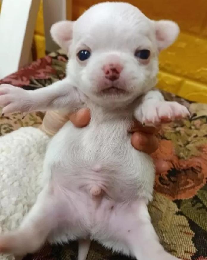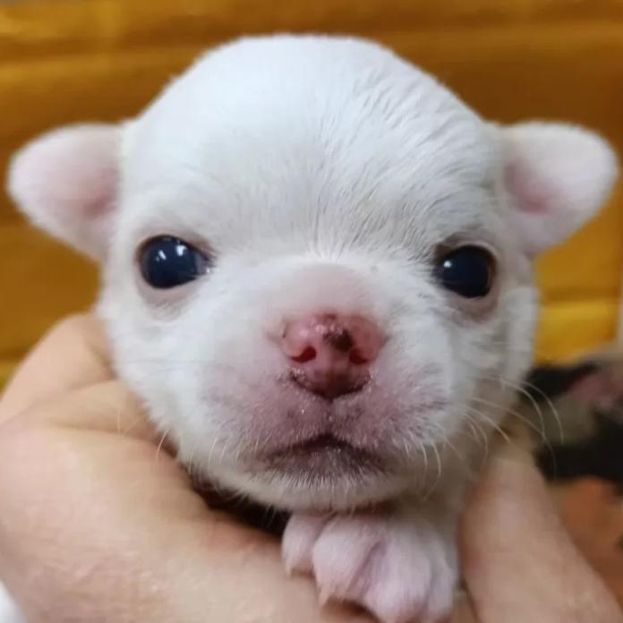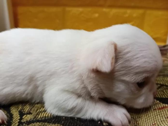 チワワ(ロング)の男の子、毛色は純白のホワイト。まるで小さな王子様のような雰囲気をまとった、とっても可愛いプリンスです🤍ふわっとした被毛と愛らしいお顔立ちで、思わず守ってあげたくなる存在です。