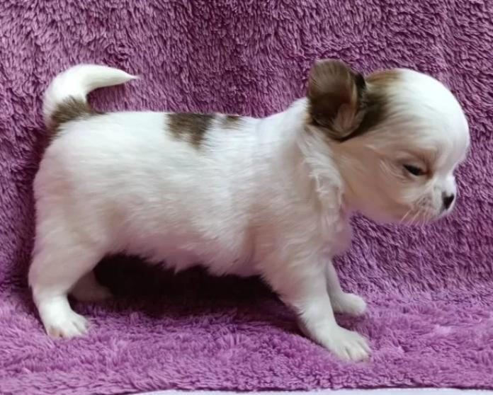 チワワ(ロング)の女の子、毛色は華やかなレッド&ホワイト。優しい色合いと愛らしい表情がとても印象的な子です。小さな体ながら存在感は抜群で、見ているだけでキュンとしてしまう可愛さです✨