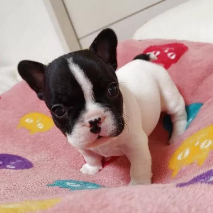 犬種は**フレンチブルドッグ**、毛色は明るく華やかなパイド。思わず見とれてしまうほどのイケメン君です✨くりっと大きな目が印象的で、表情がとっても豊か。さらに、ボディーには可愛いハート柄が入ったショートボディータイプで、全体のバランスも良く、存在感抜群の子です💖