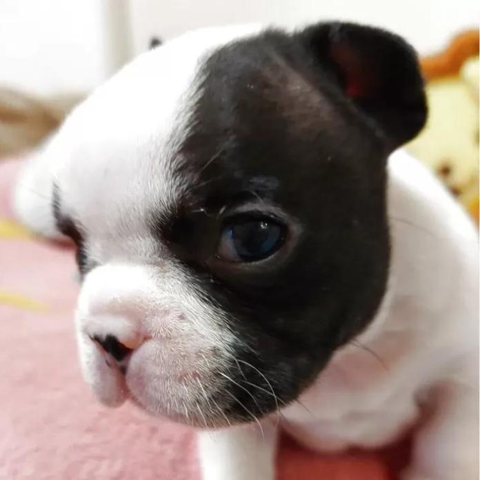 犬種は**フレンチブルドッグ**、毛色は明るく華やかなパイド。くっきりとした模様がとても綺麗で、パイドらしい存在感たっぷりのイケメン君です✨ぱっちりと大きな目が印象的で、写真でももちろん可愛いですが、実物はさらに可愛さ倍増です💕