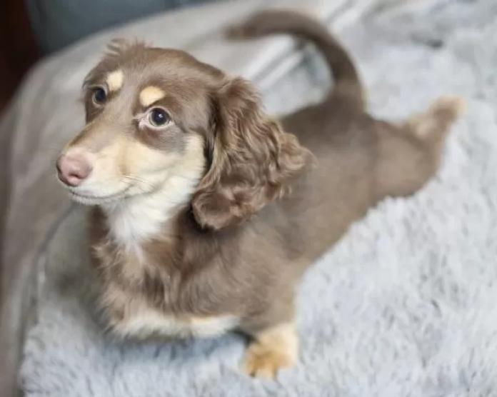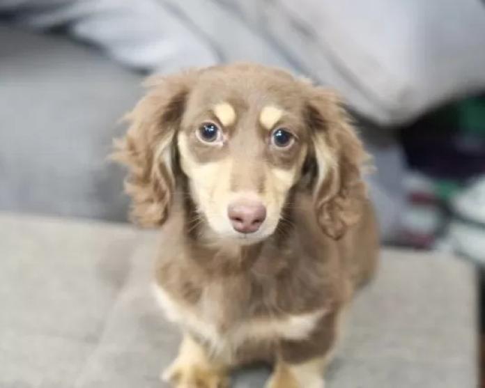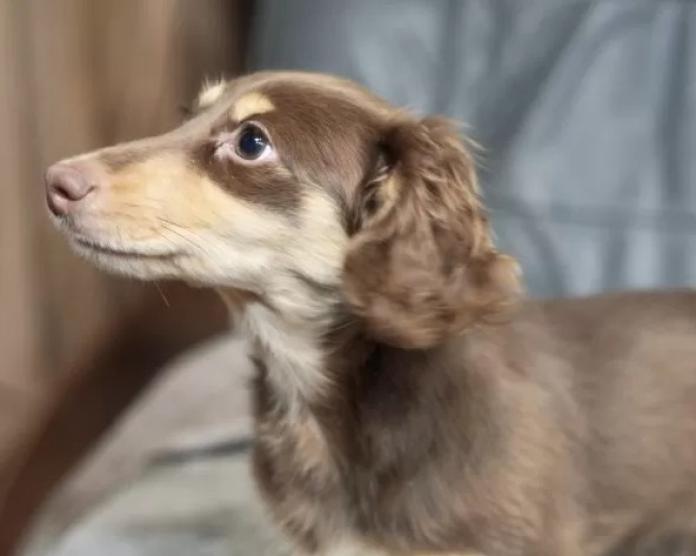 カニンヘンダックスフンド(ロング)、チョコイエローの男の子になります。綺麗で優しい色合いのチョコイエローの毛色がとても可愛く、見ているだけで癒される子です🐶✨