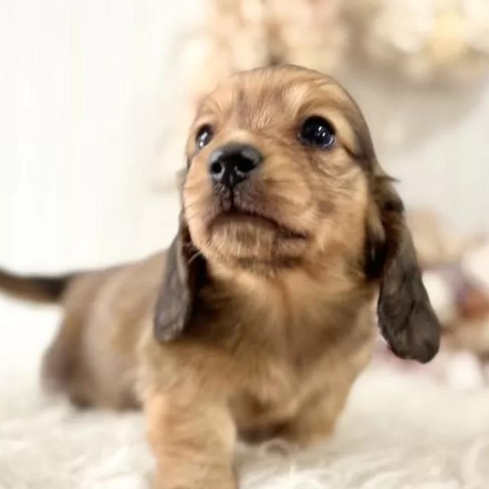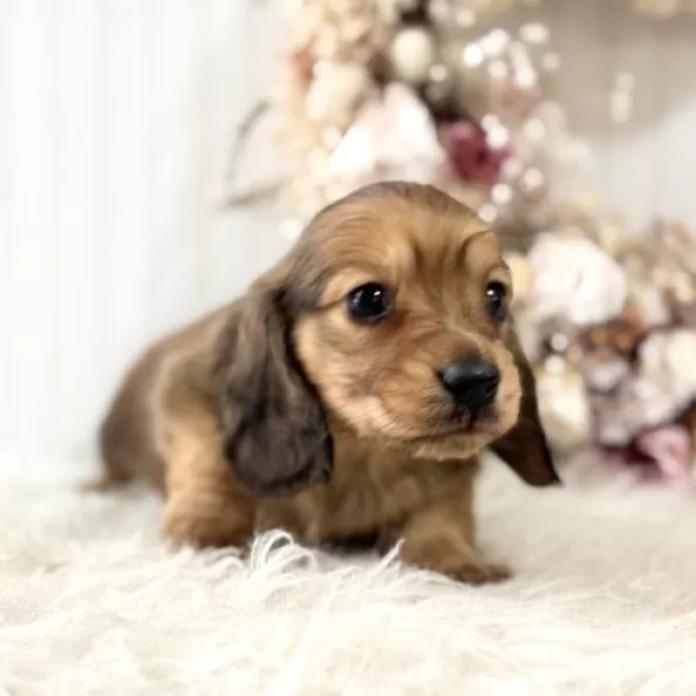 カニンヘンダックスフンドらしい上品なシェーデッドレッドの毛色に、骨太でしっかりとした骨格、そして豊かな毛量を兼ね備えた非常にクオリティの高い子です。全体のバランスも良く、将来はショードッグとしても十分に期待できる魅力を持っています。見た目の美しさと存在感を感じていただける、とてもおすすめの男の子です😊