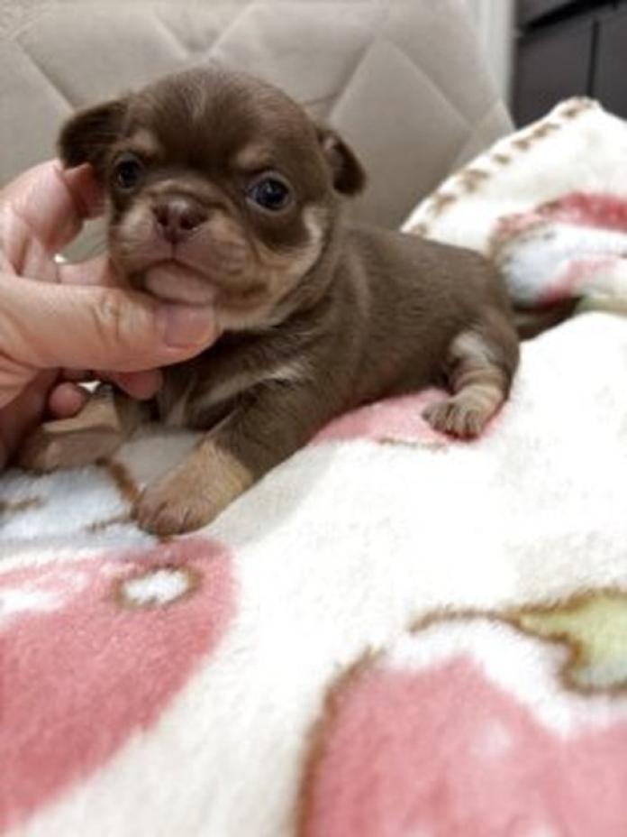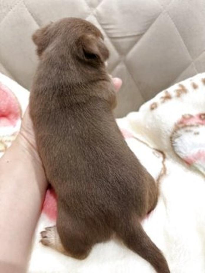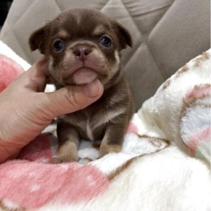 チワワ(スムース)のチョコタンクリームカラーで、優しい色合いとあどけない表情がたまらない可愛さの子です✨ 特にタレ目のやわらかいお顔立ちは、見ているだけで癒されます☺️