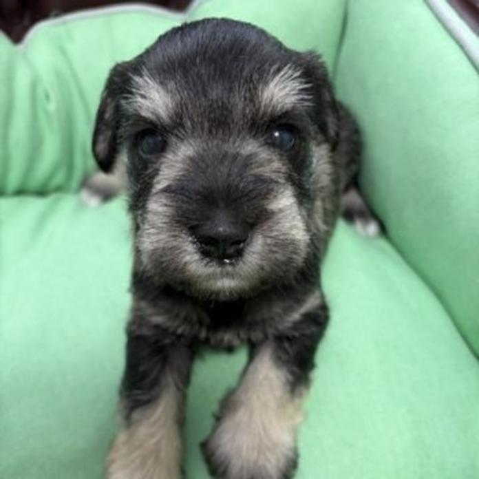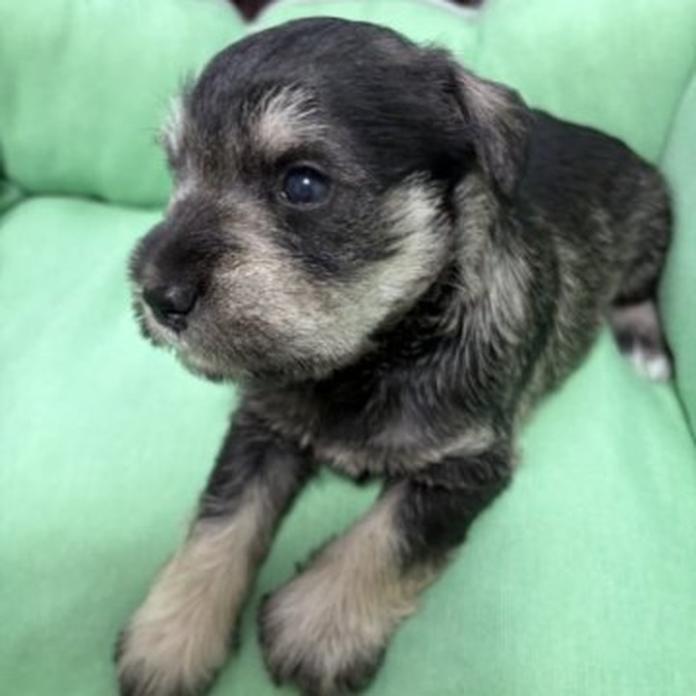 ミニチュアシュナウザーのソルトアンドペッパーの男の子で、ぱっちりとした印象的な目と整ったお顔立ちがとても魅力的な子です😊 見つめられると思わず引き込まれてしまうような可愛さがありますよ♪