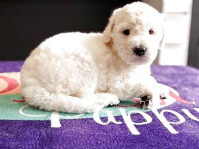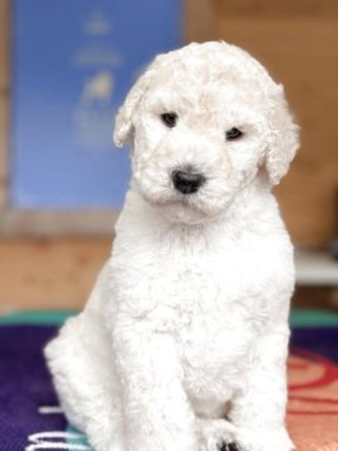 スタンダードプードルのホワイトの男の子で、ふわっとした真っ白な被毛とくりくりの大きなおめめがとても愛らしい子です💕