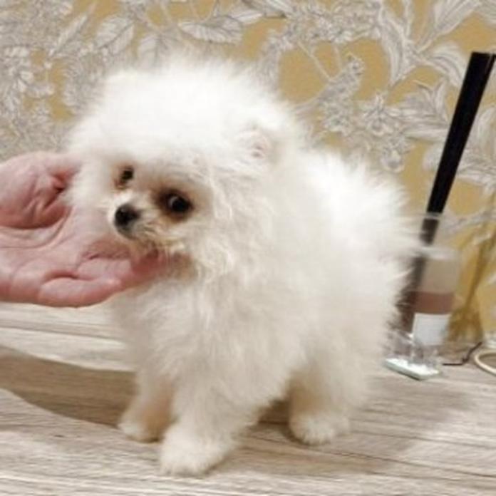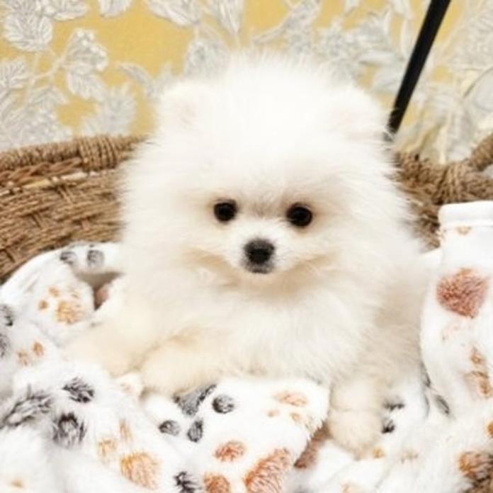 ポメラニアンのホワイトの女の子で、まるで雪のように真っ白な被毛とバランスの取れた体型がとても魅力的な子です💕