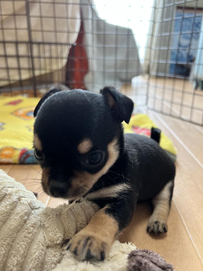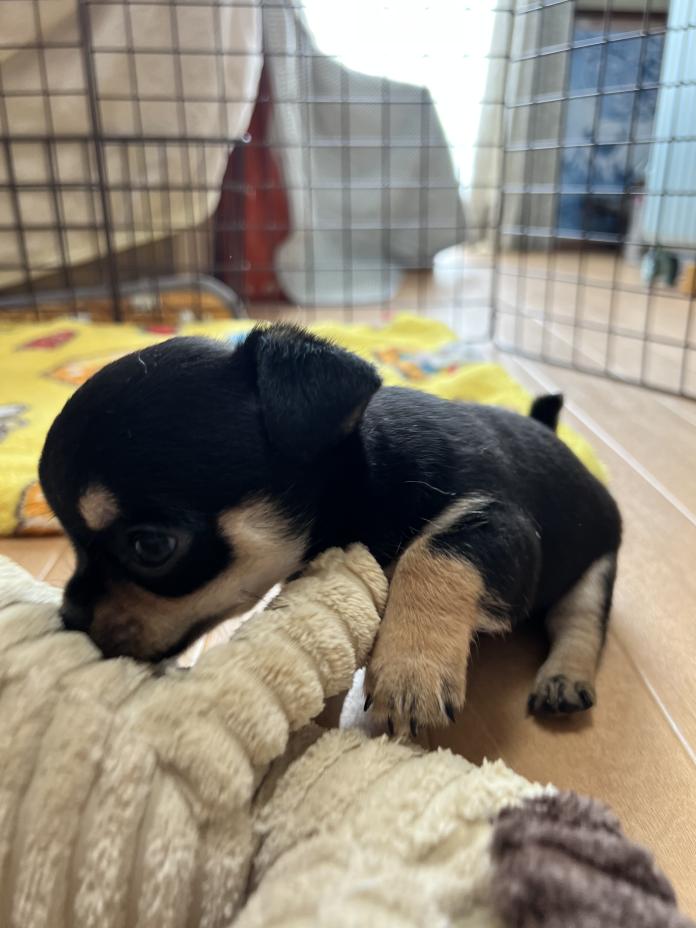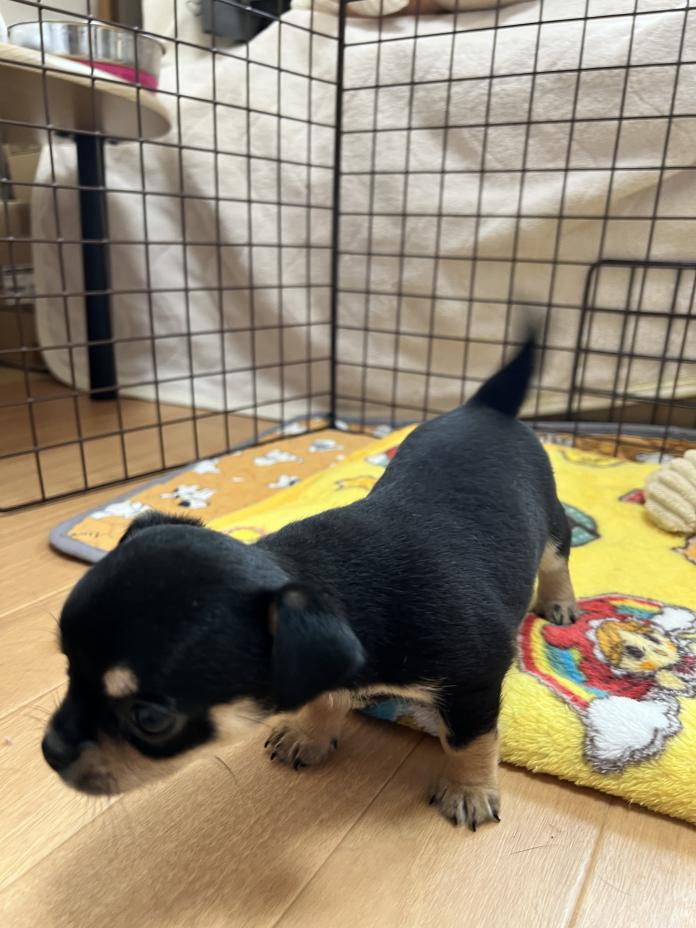 父親の母型AM CH系統母親JKCチャンピオン直子の優良血統になります。ちょっと大き目のブラックタンホワイトのスムースになります。成長時2.6kg〜3kg予想