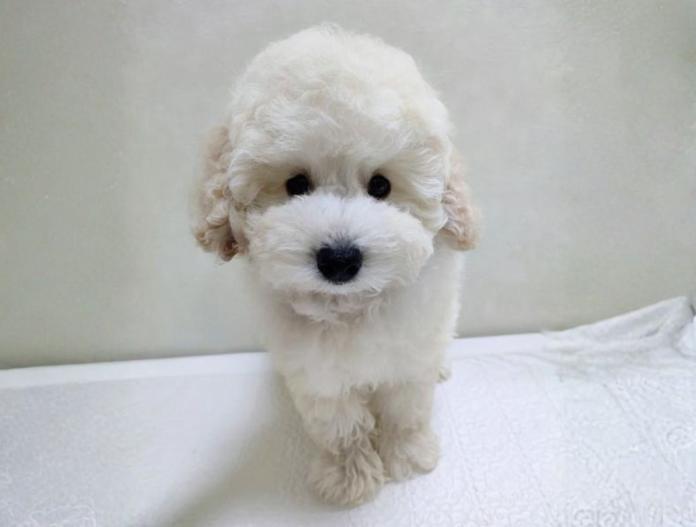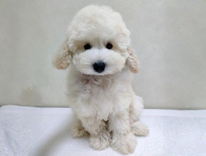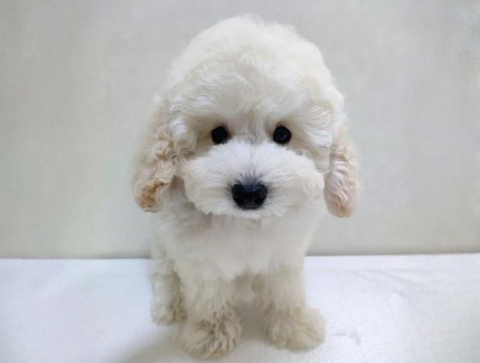 ✨トイプードルの男の子「ポニョくん」。美しいホワイトカラーで、バランスの良い立派な骨格をしています。これからの成長もとても楽しみな、頼もしさを感じる男の子です。