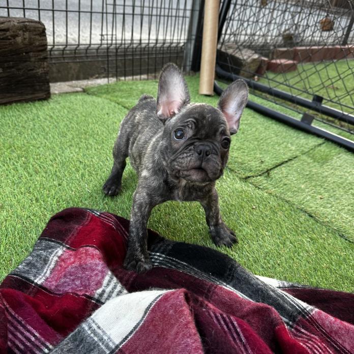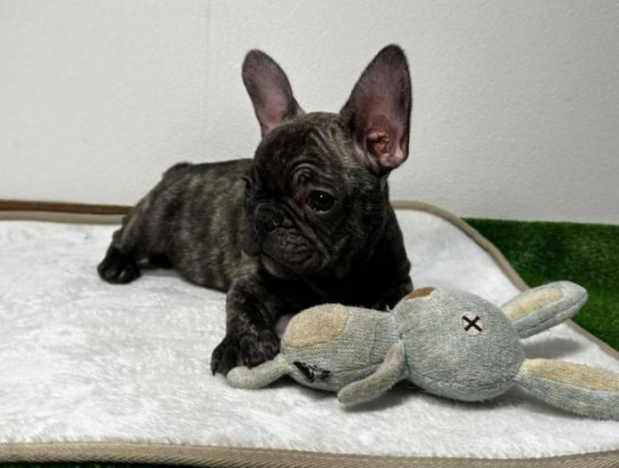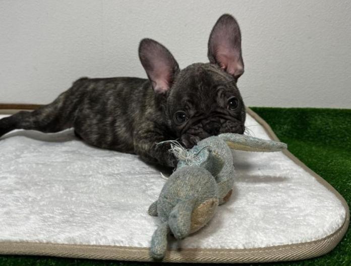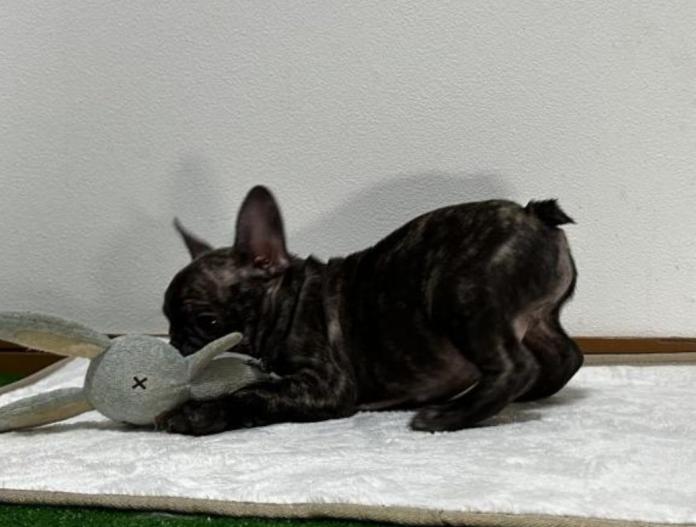 フレンチブルドッグらしい愛らしいお顔に、これからさらに綺麗なタイガーブリンドルへと成長していきそうな、とても楽しみな子です。被毛のコントラストが美しく出てきており、大人になるにつれてさらに魅力が増してくるタイプだと思います😊✨