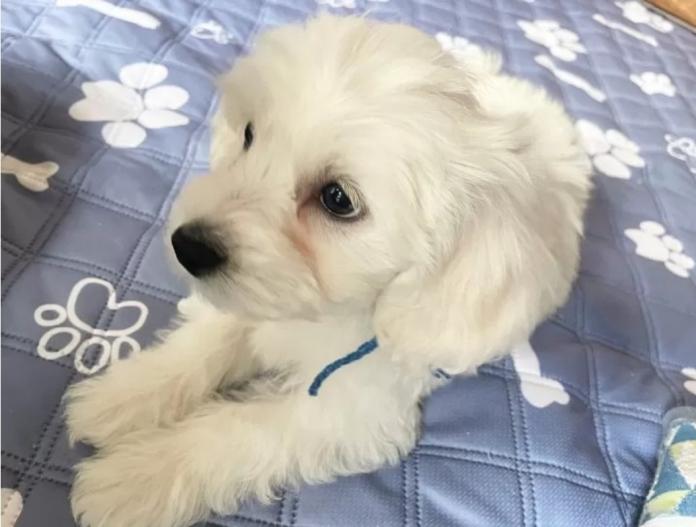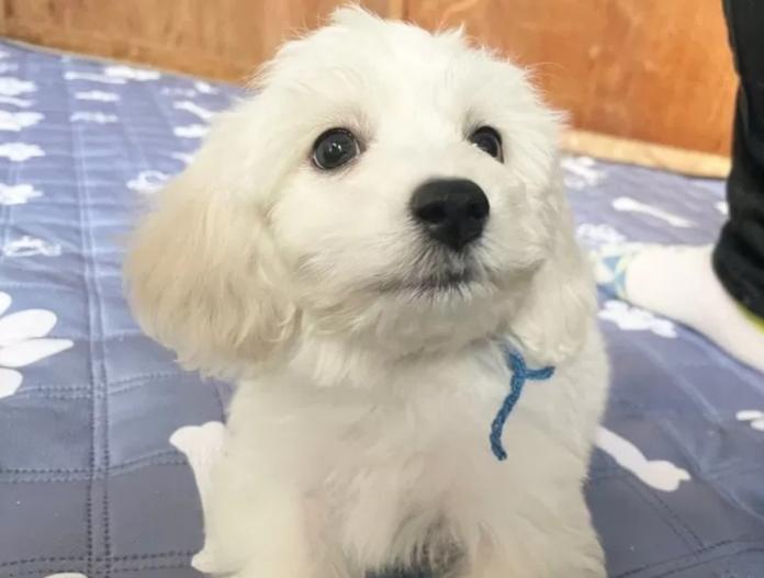 ビションフリーゼらしい真っ白でふわふわの被毛を持ち、兄妹の中でもひときわ目を引く、いちばん大きく成長している「青くん💙」。安心感のある佇まいで、見ているだけで頼もしさを感じます。